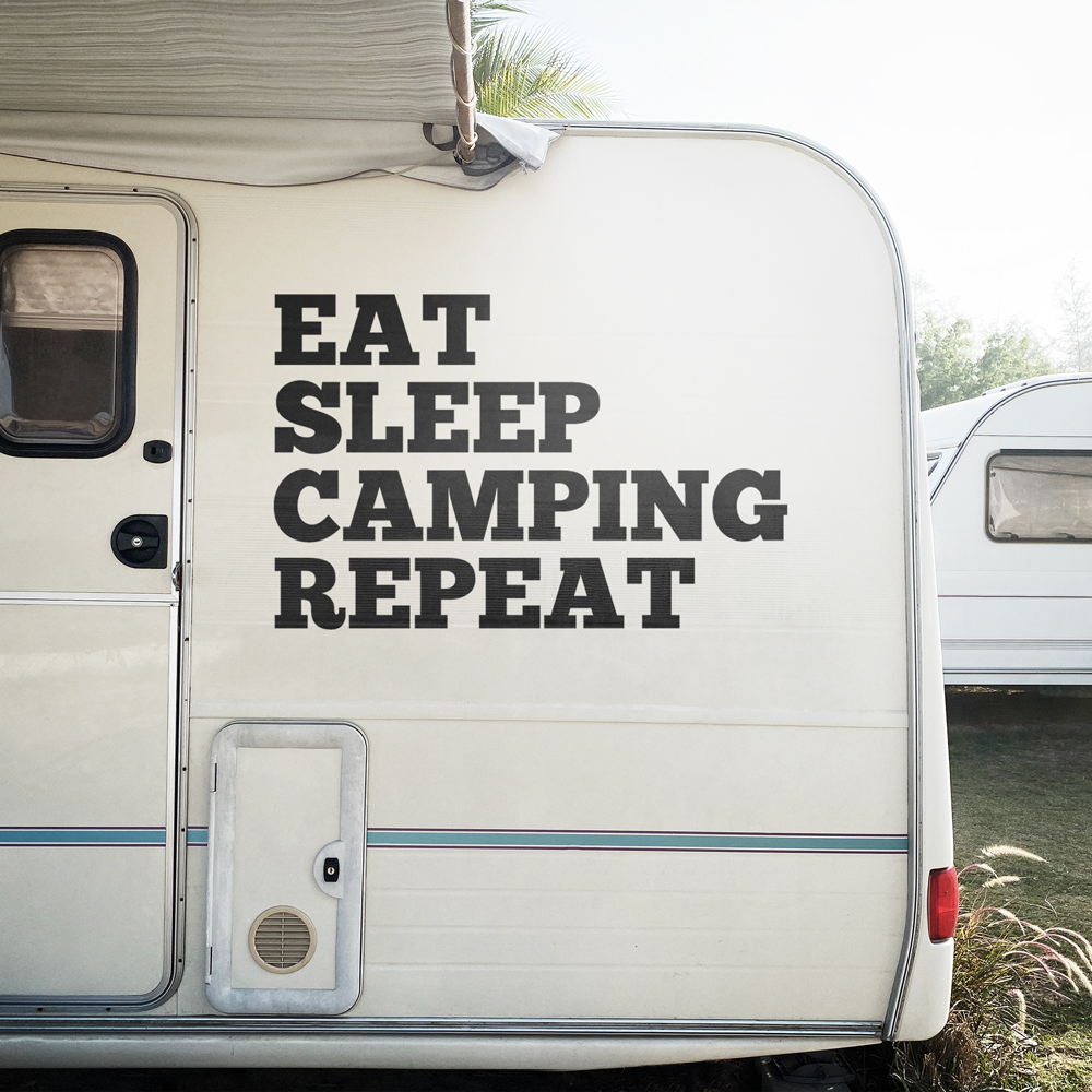 Samolepka Eat Sleep Camping Repeat bude dodána včetně přenosné folie ke snadné aplikaci na požadované místo a návodu k lepení.